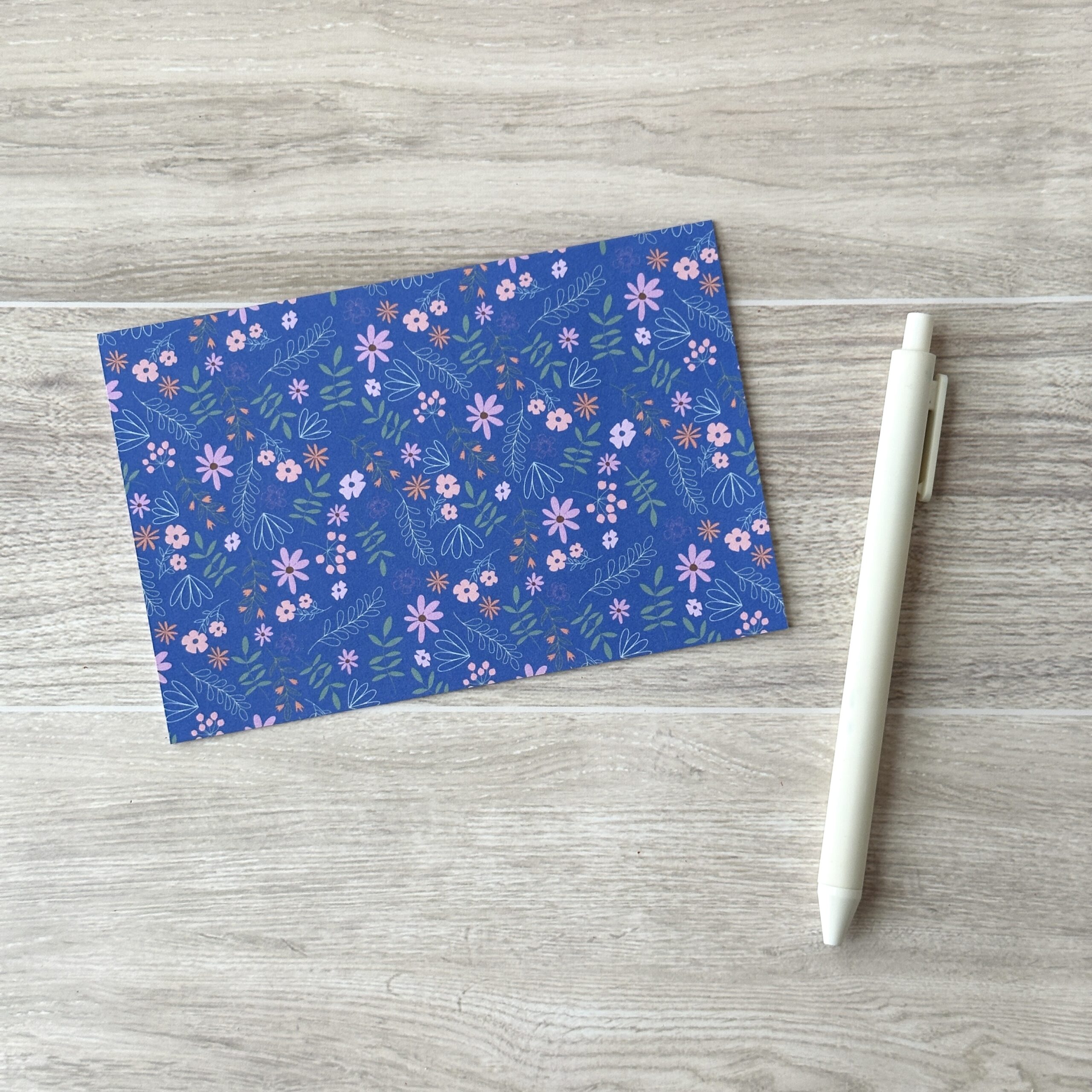 Share a thoughtful message with this hand-drawn blue floral 4″ x 6″greeting card. Each card features a unique design on the front and a blank interior for letters or notes. Comes with a matching handmade envelope. Perfect for personal messages, gifting, or special occasions.