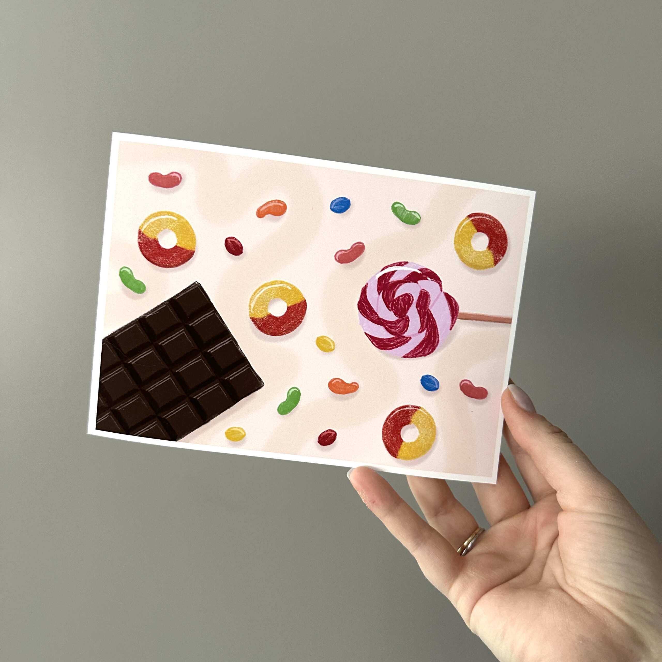 This print started from a March drawing prompt and I decided I loved it and wanted to make it a print. It features some favorite sweets as well as honorable mention – peach rings (I dont like them but I know they’re popular).