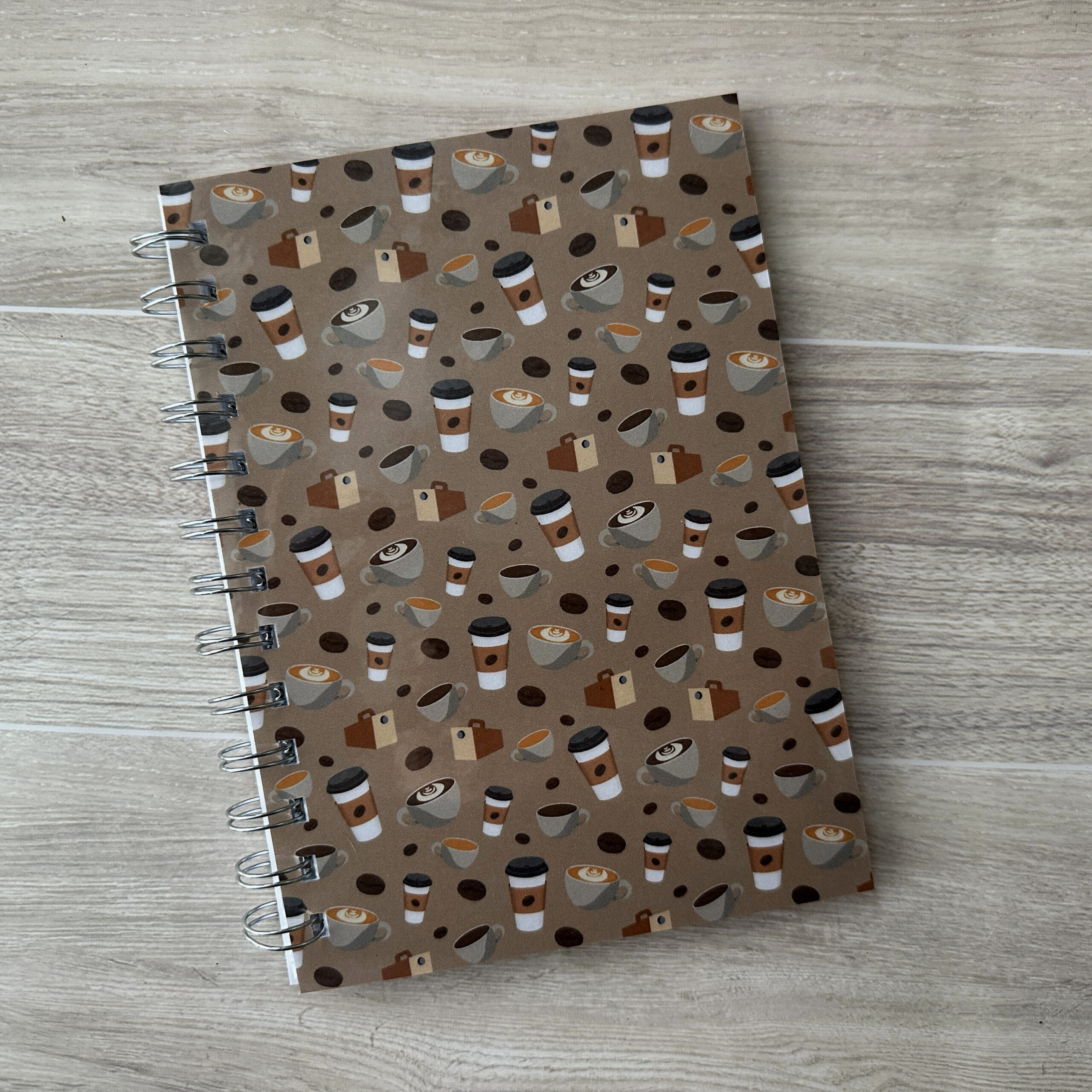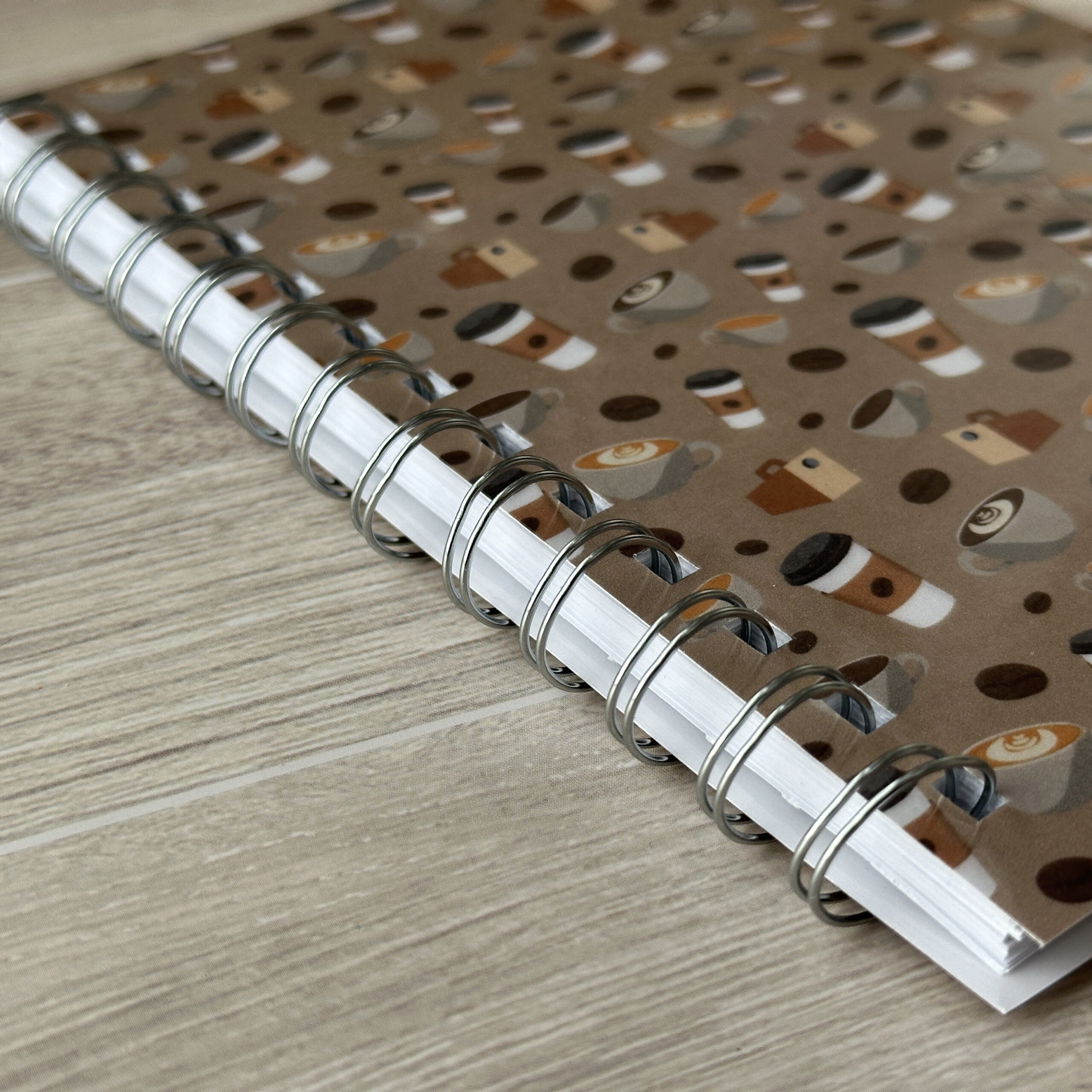 This 50 page hand-drawn coffee themed notebook combines art and function. The cover is printed on 110lb/199gsm cardstock and laminated for durability. Inside, 28lb/105gsm lined paper is hand-cut and bound, finished with a wire-o binding in a color chosen to complement the design. Perfect for journaling, notes, or sketches.
