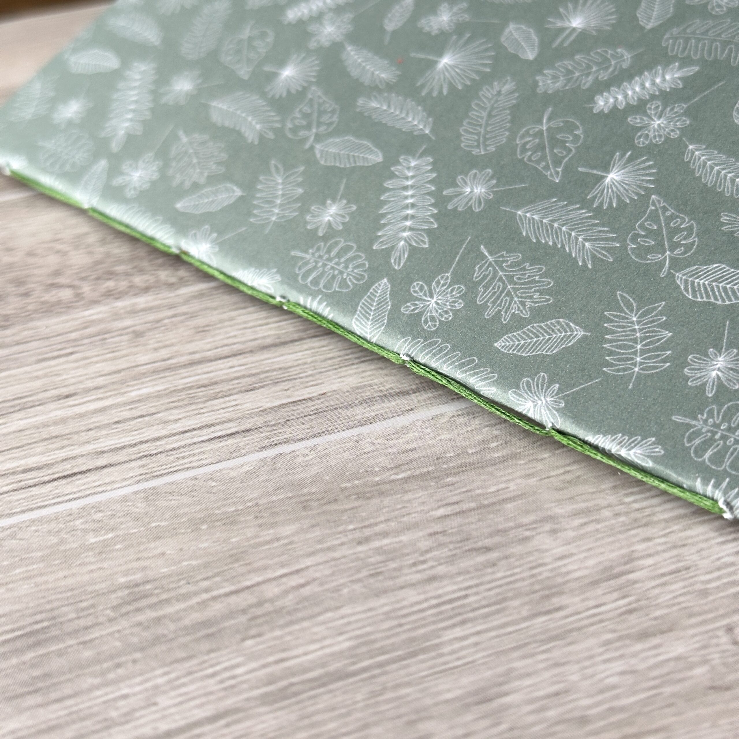 This notebook features a hand-drawn cover with assorted green leaves on 110lb/199gsm cardstock and interior pages printed on 28lb/105gsm paper. Each notebook is hand-cut and hand-bound using a pamphlet stitch with beeswax-ed embroidery floss for a durable, handcrafted finish. Ideal for journaling, creative writing, or gifting.