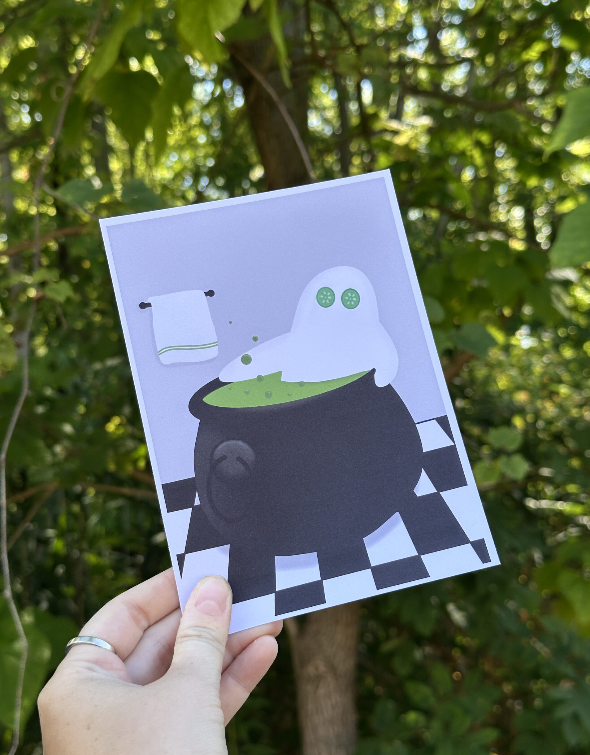 Bring unique, hand-drawn artwork into your space with this fun ghost in a cauldron bath art print. Each piece starts as an original illustration, then is printed on high-quality cardstock to capture every detail and vibrant color. Perfect for framing, gifting, or adding a touch of creativity to your home or office.