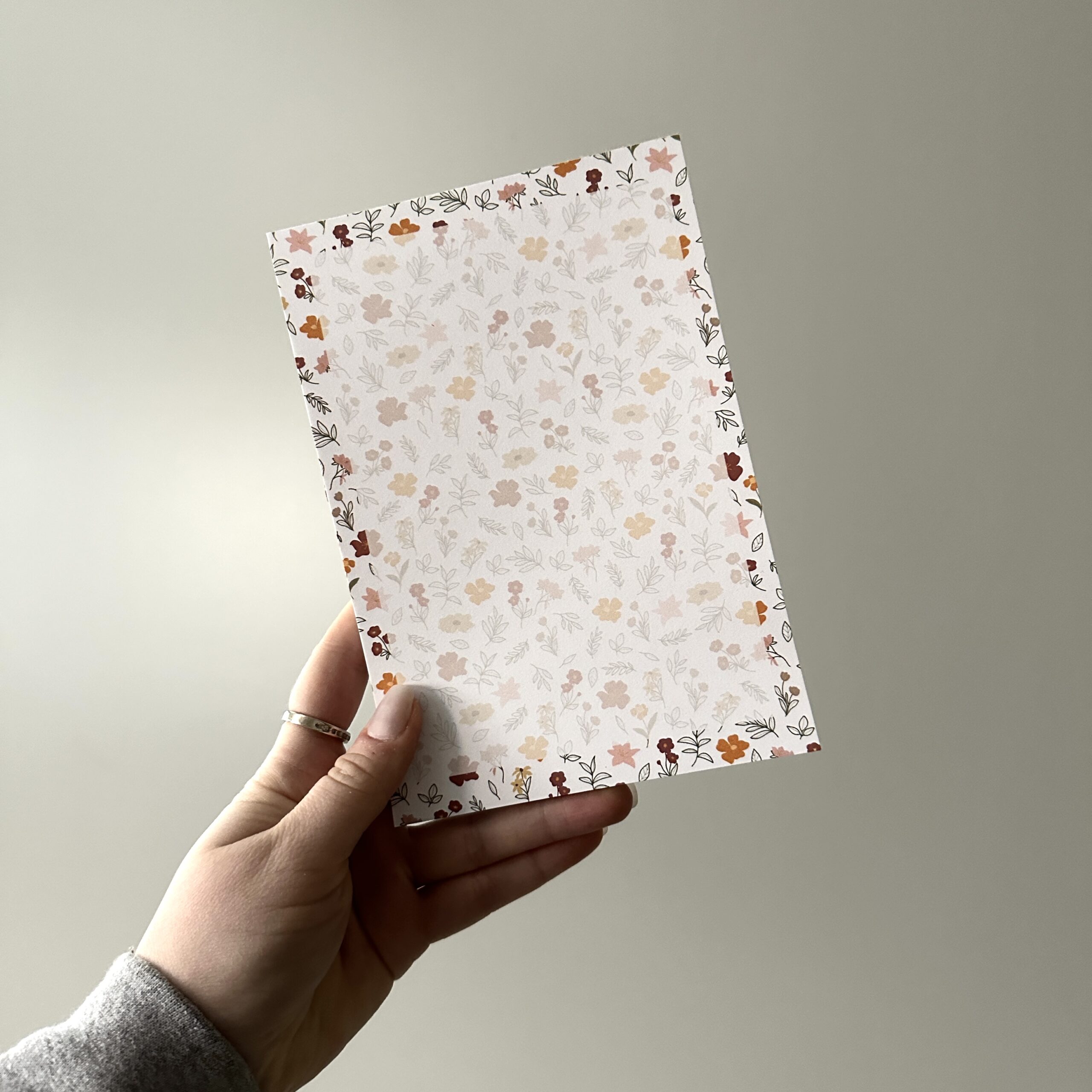 Hand-bound 5×7 paper pads featuring original hand-drawn designs, printed on 28lb paper. Perfect for notes, lists, and ideas.