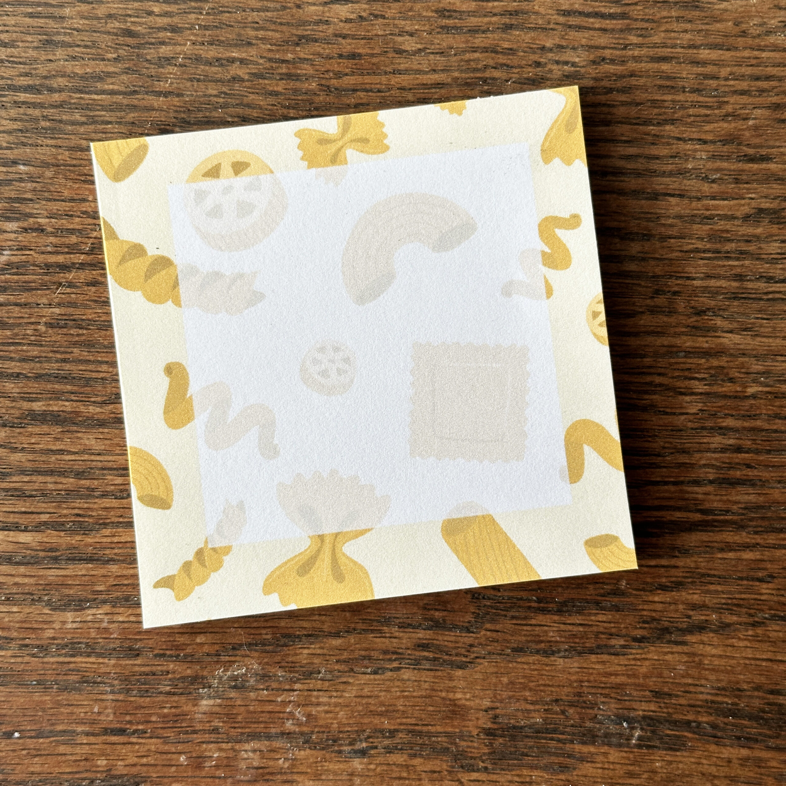 Organize your day with style using these hand-bound sticky notes featuring a pasta pattern. Each pad features original hand-drawn patterns on 28lb/105gsm paper and is hand-cut and bound for an artisanal touch. Perfect for reminders, messages, or creative doodles.
