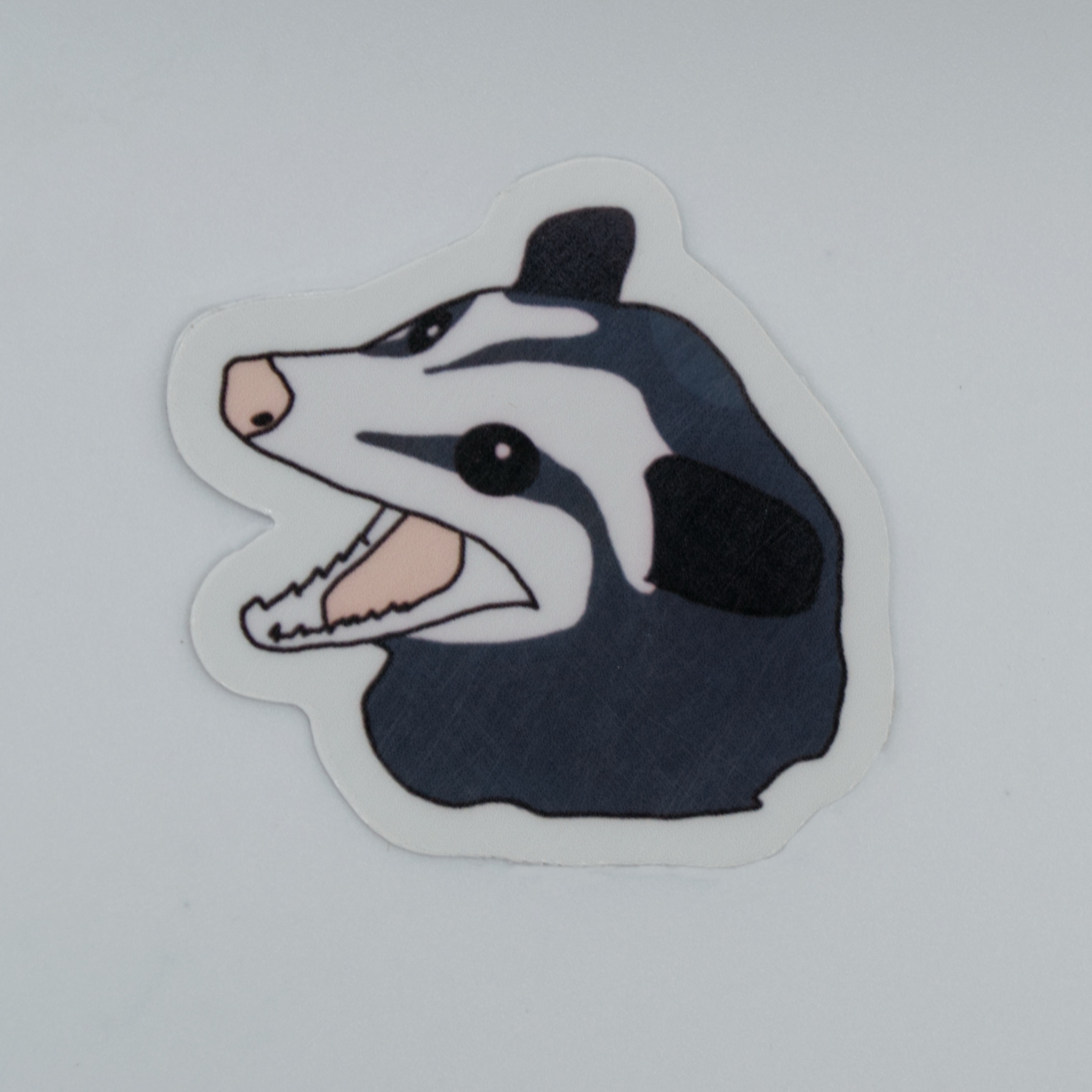 Vinyl, laminated sticker depicting a screaming opossum. Each design is hand-drawn, then printed on durable vinyl, laminated for extra protection, and die cut for a clean, polished look.