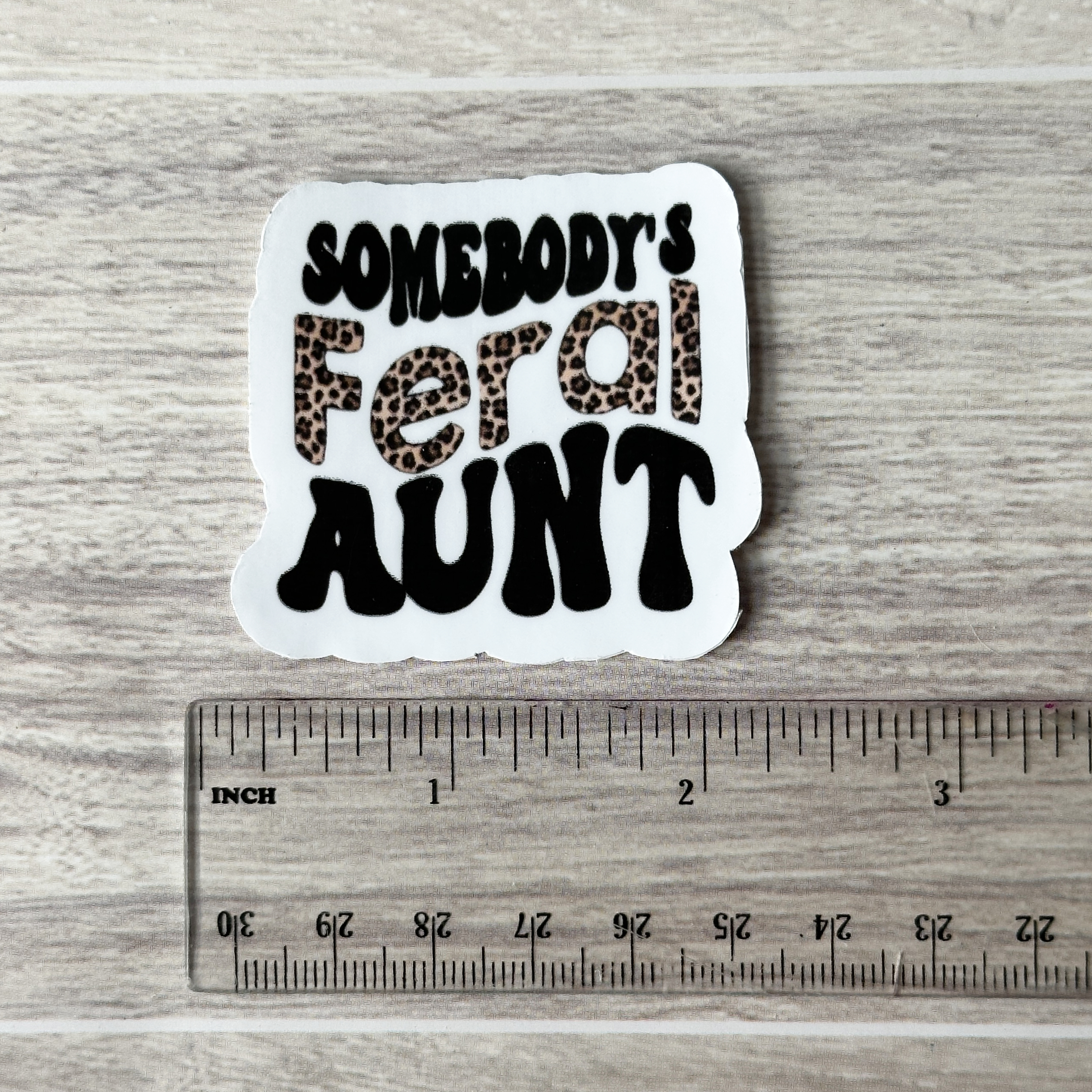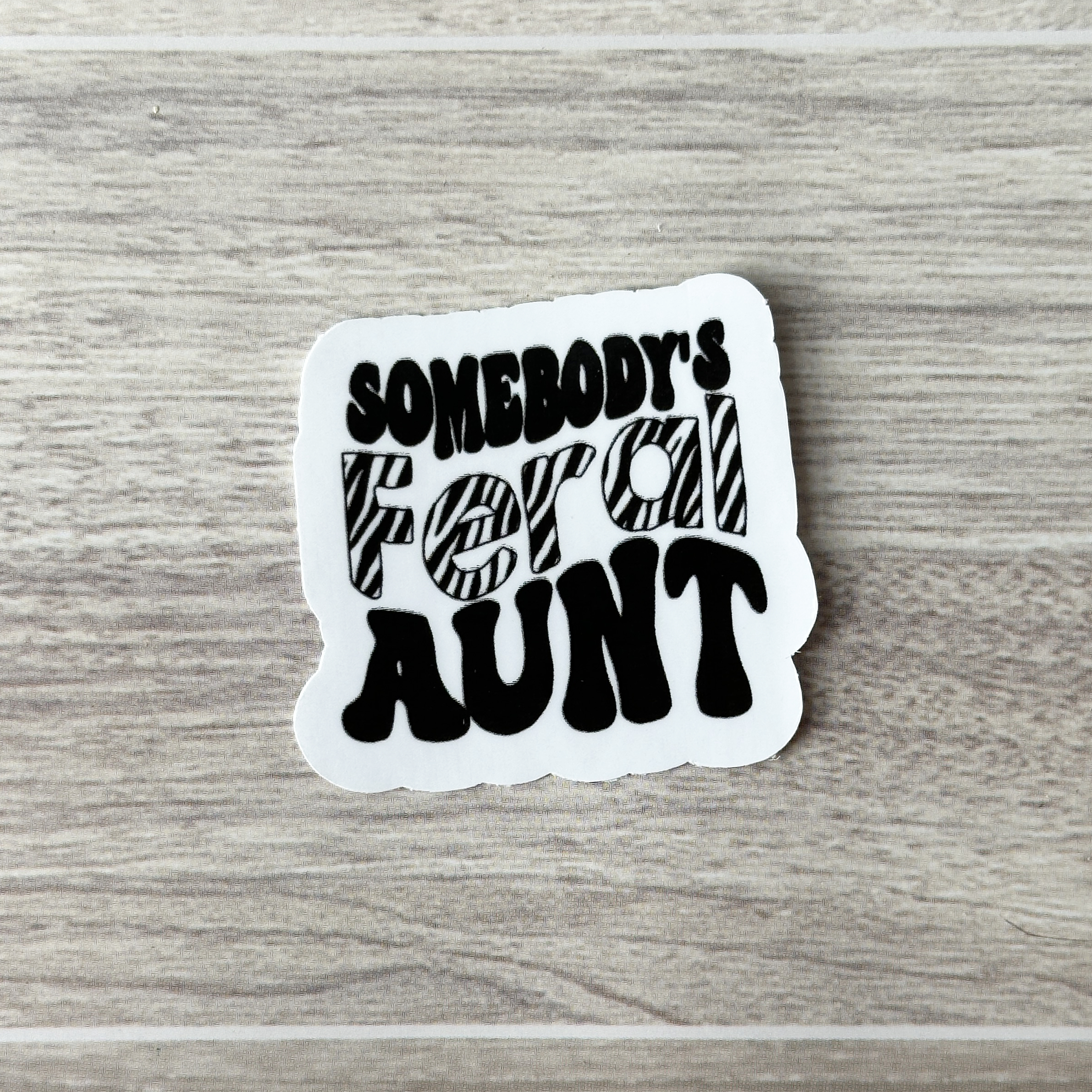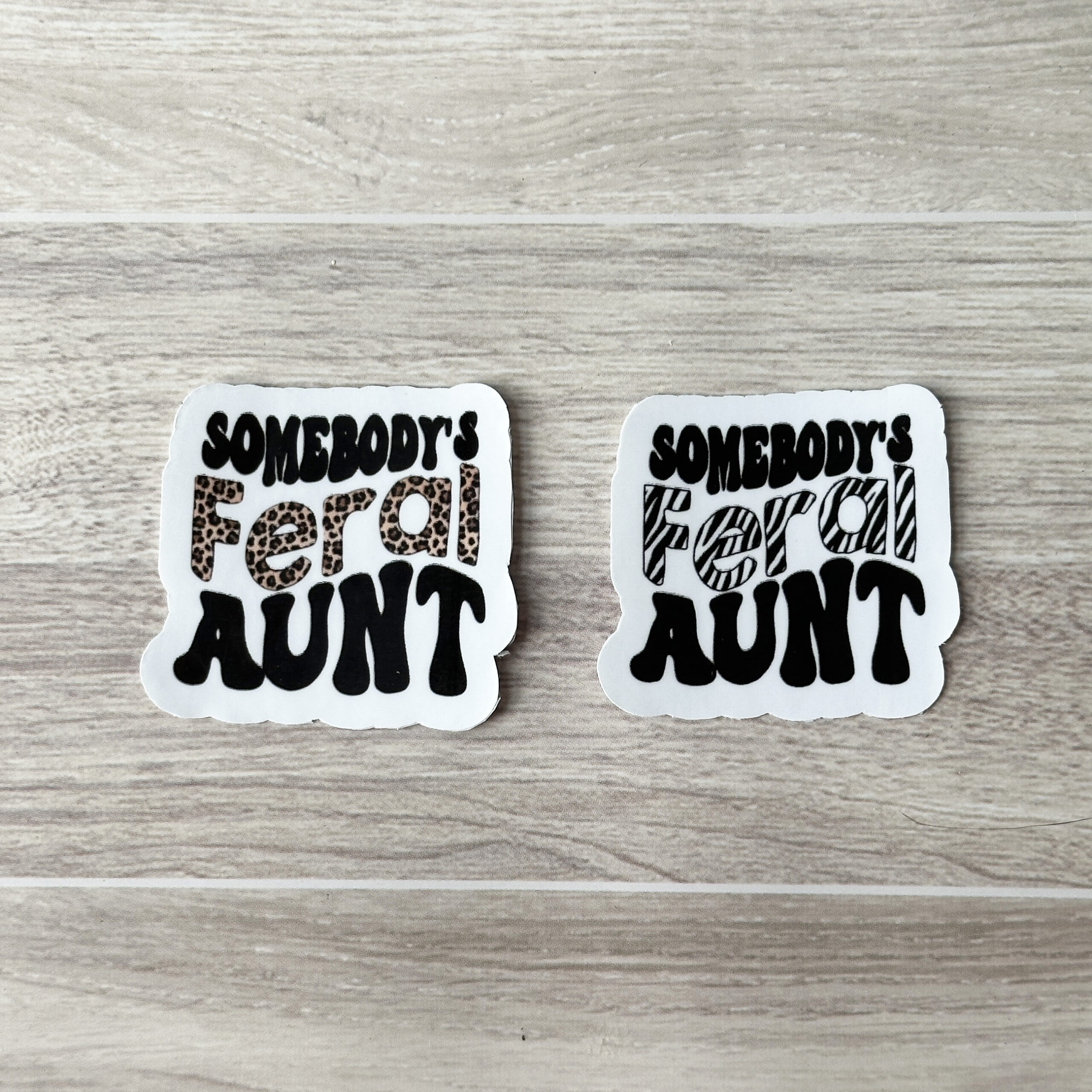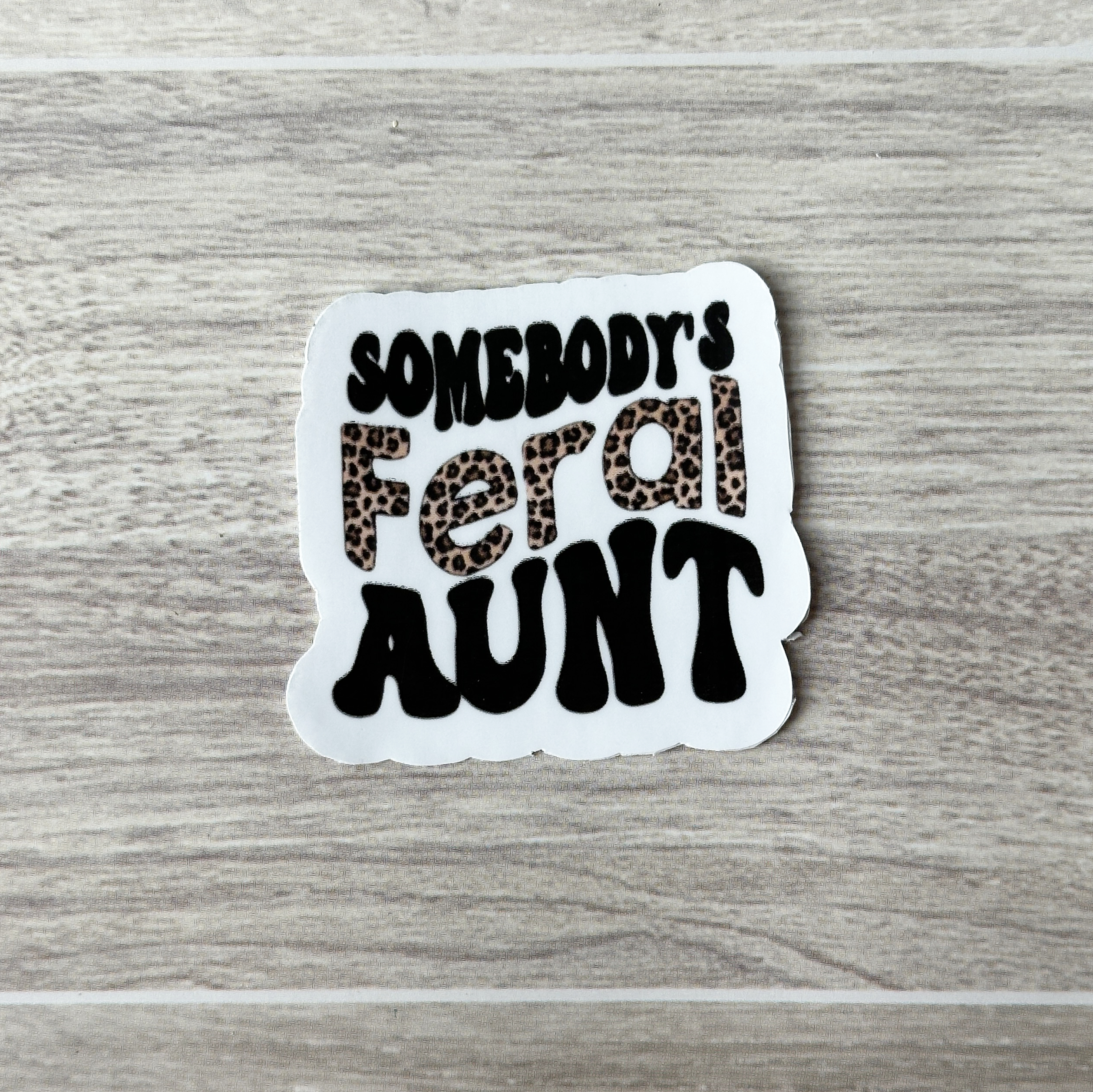 Durable vinyl sticker “Somebody’s feral aunt” offered in cheetah print or zebra print for your wild side.
